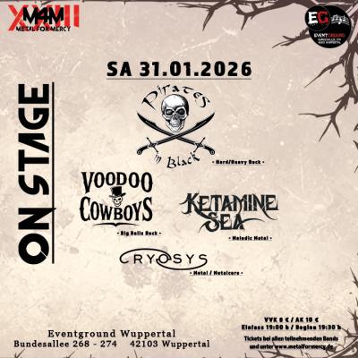 Zu sehen sind dann: Pirates in Black, Ketamine Sea, Voodoo Cowboys und Cryosys. Danach geht es am 21.2.2026 in der Werkstadt weiter mit Farbentaub, Neon Blau, Maybe on Stage und Catch a Fly.